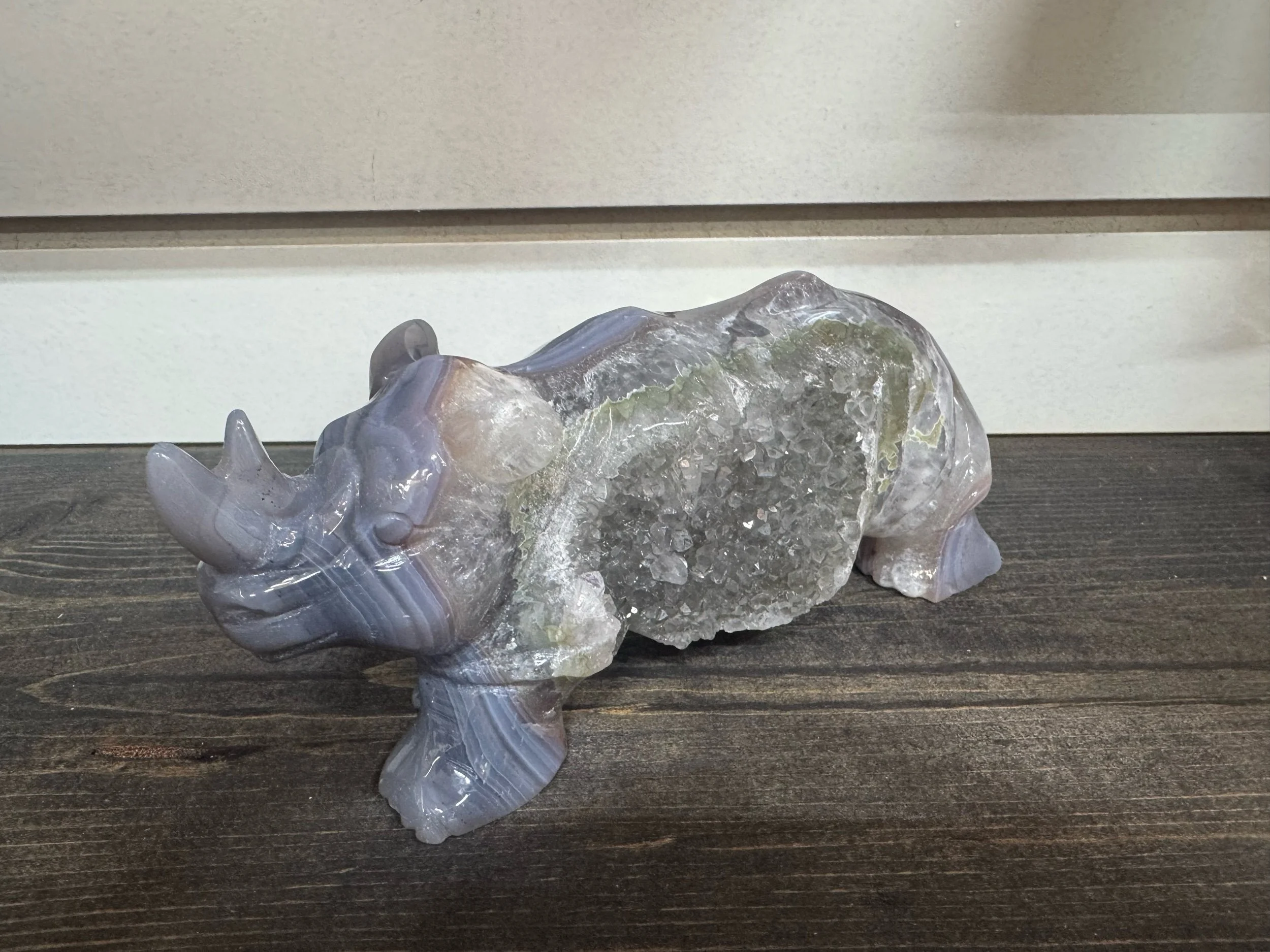 Shop › Druzy Agate Rhino Image 1 of 5 Image 2 of 5 Image 3 of 5 Image 4 of 5 Image 5 of 5 Druzy Agate Rhino $219.00 Druzy agate rhino carving. The item is 7in x 3 1/4in. Add To Cart Added! Druzy agate rhino carving. The item is 7in x 3 1/4in.
